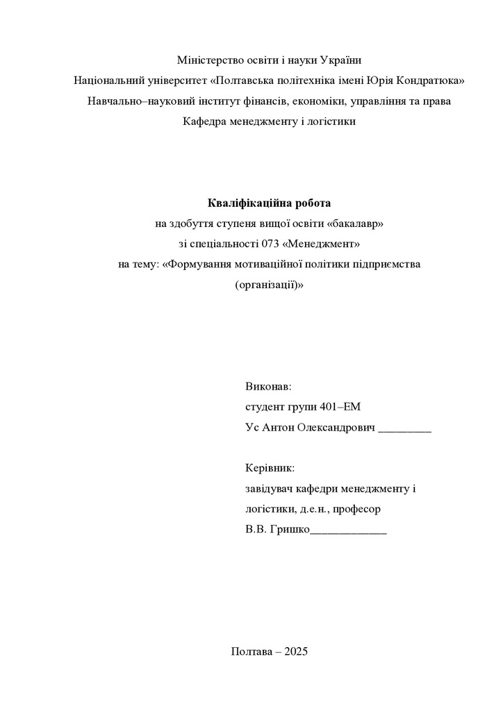Дипломна робота 2026/03/12Формування мотиваційної політики підприємства (організації)