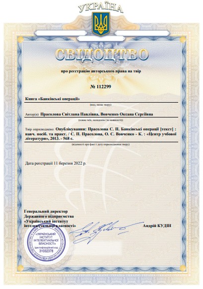 Свідоцтво про реєстрацію авторського права на твір № 112299. Книга «Банківські операції»