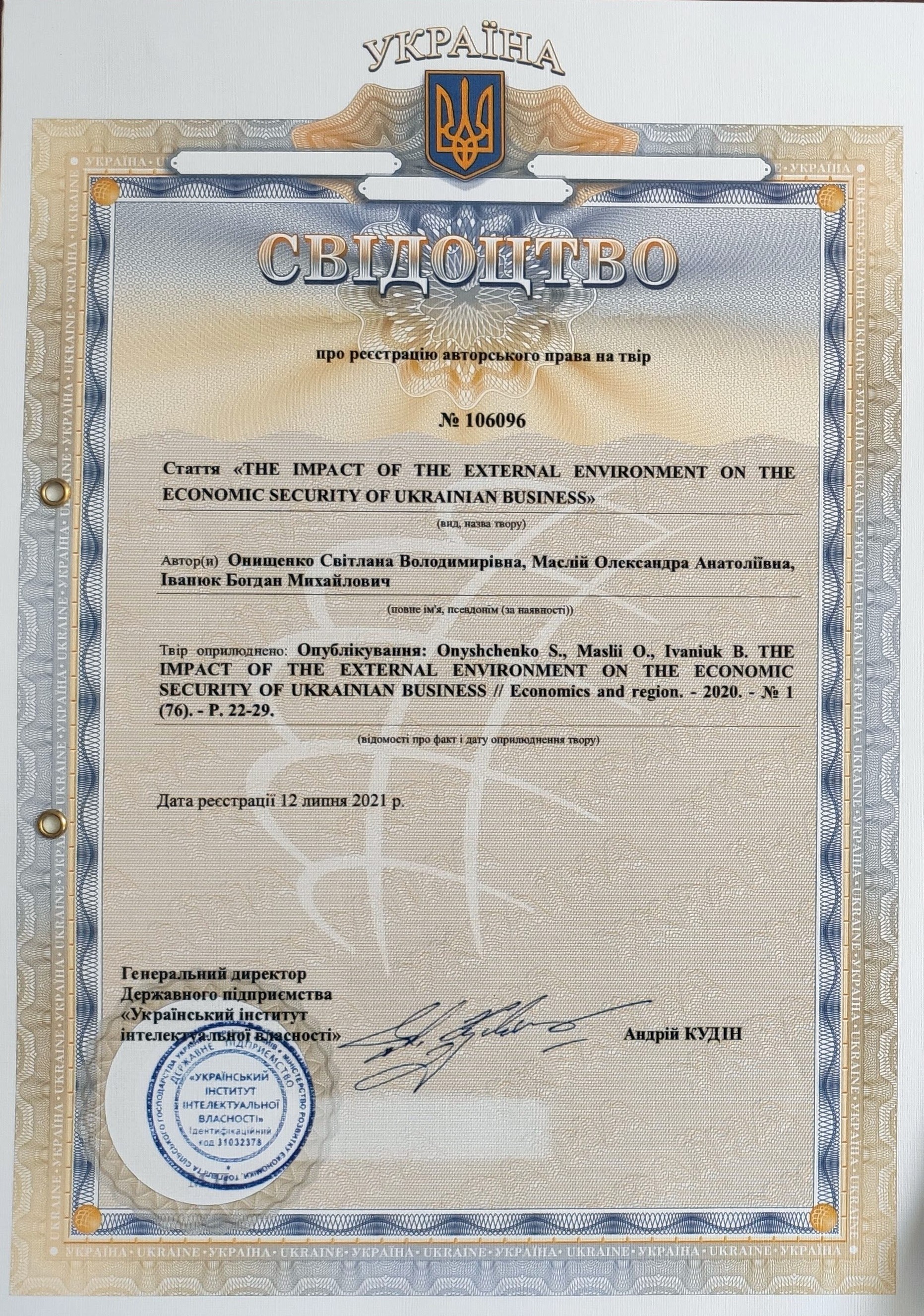 Свідоцтво про реєстрацію авторського права 106096 на твір «The impact of the external environment on the economic security of ukrainian business»