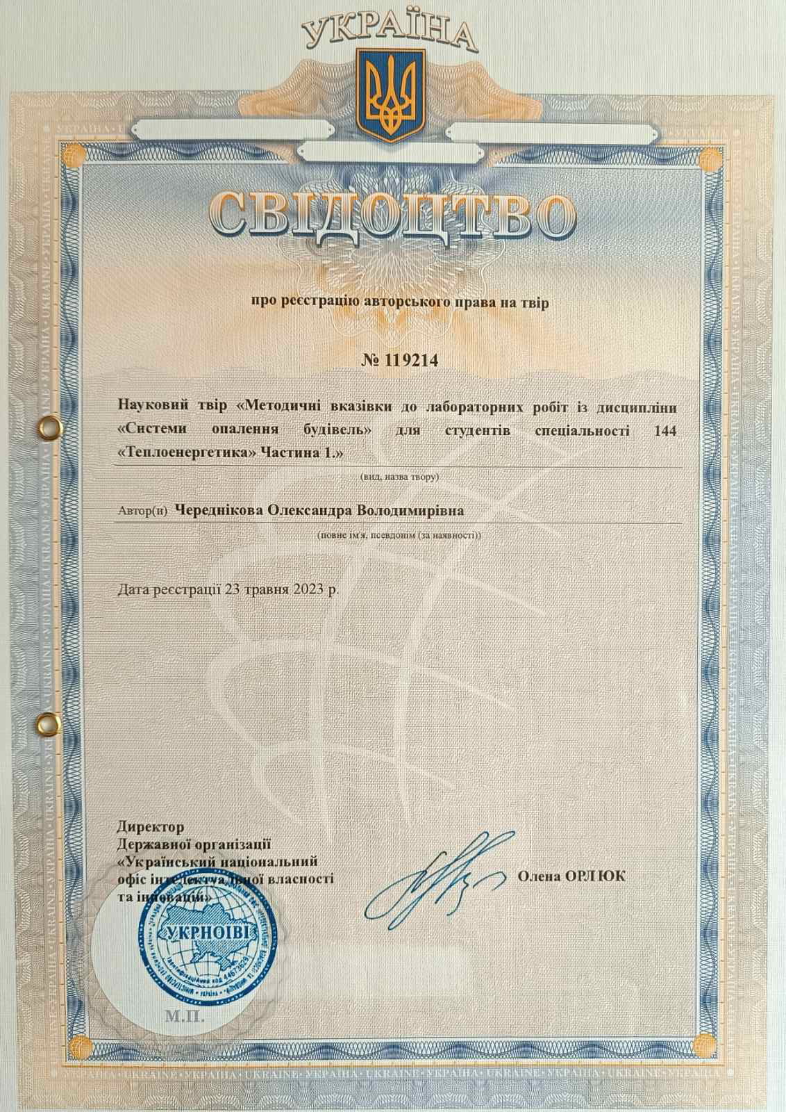 Свідоцтво про реєстрацію авторського права № 119214 на твір «Методичні вказівки до лабораторних робіт із дисципліни «Системи опалення будівель» для студентів спеціальності 144 «Теплоенергетика». Частина 1»