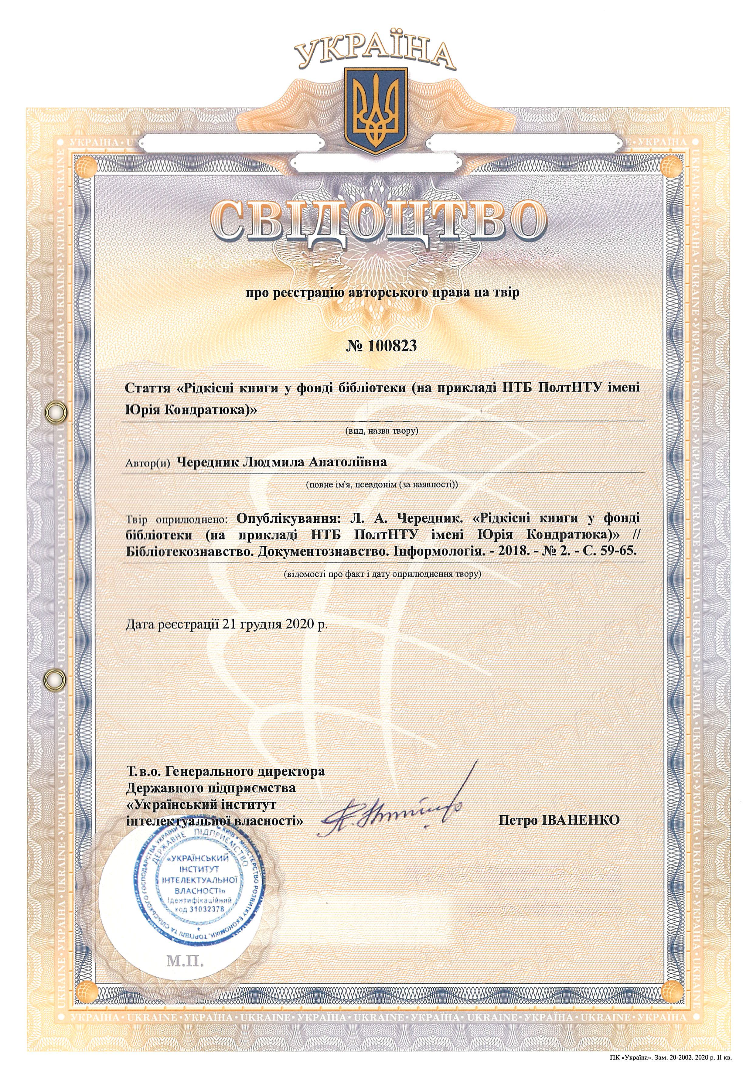 Свідоцтво про реєстрацію авторського права № 100823 Україна на твір "Рідкісні книги у фонді бібліотеки (на прикладі НТБ ПолтНТУ імені Юрія Кондратюка)"