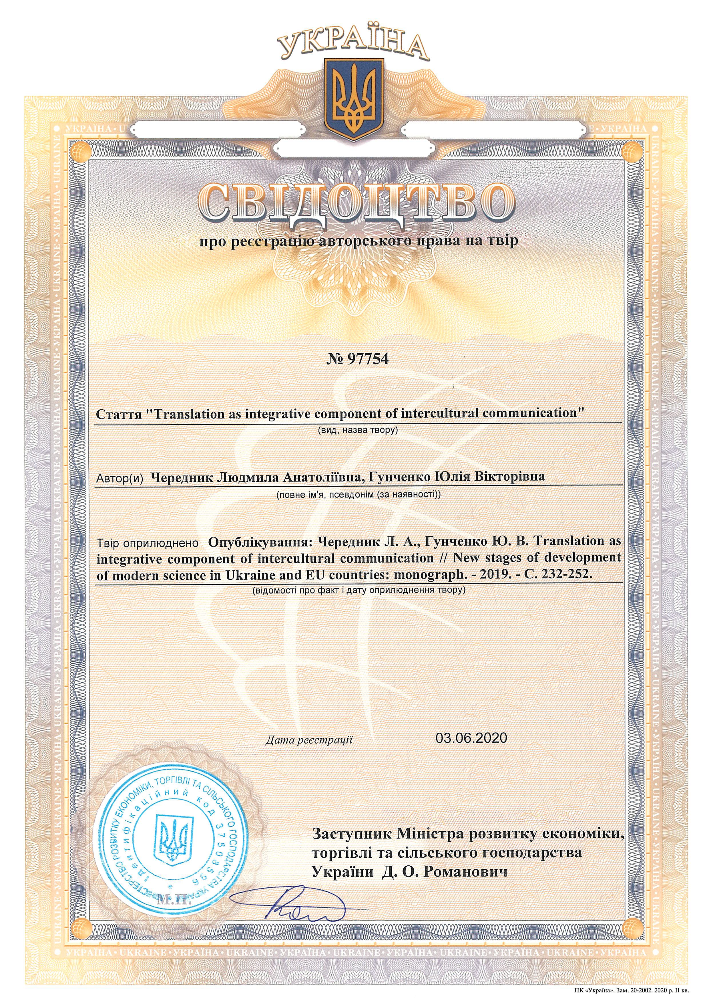 Свідоцтво про реєстрацію авторського права № 97754 Україна на твір "Translation as integrative component of intercultural communication"/ Чередник Л.А. Заявл. 03.06.2020; опубл. 31.07.2020, Бюл. № 59. С. 133–134.
