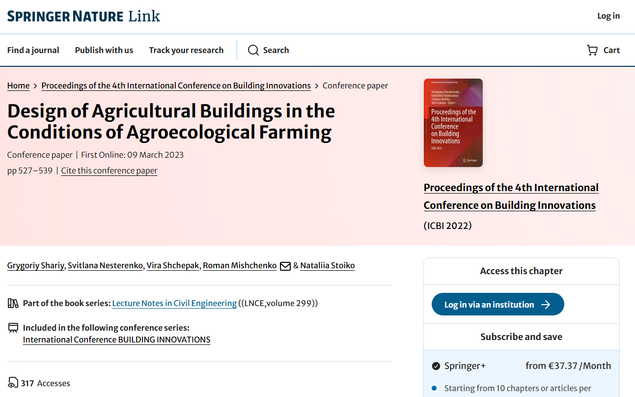 Design of Agricultural Buildings in the Conditions of Agroecological Farming / G. Shariy, S. Nesterenko, V. Shchepak, R. Mishchenko, N. Stoiko // Lecture Notes in Civil Engineering. – 2023. – Vol. 299. : Proceedings of the 4th International Conference on Building Innovations (ICBI 2022). – P. 527-539. – https://doi.org/10.1007/978-3-031-17385-1\_42