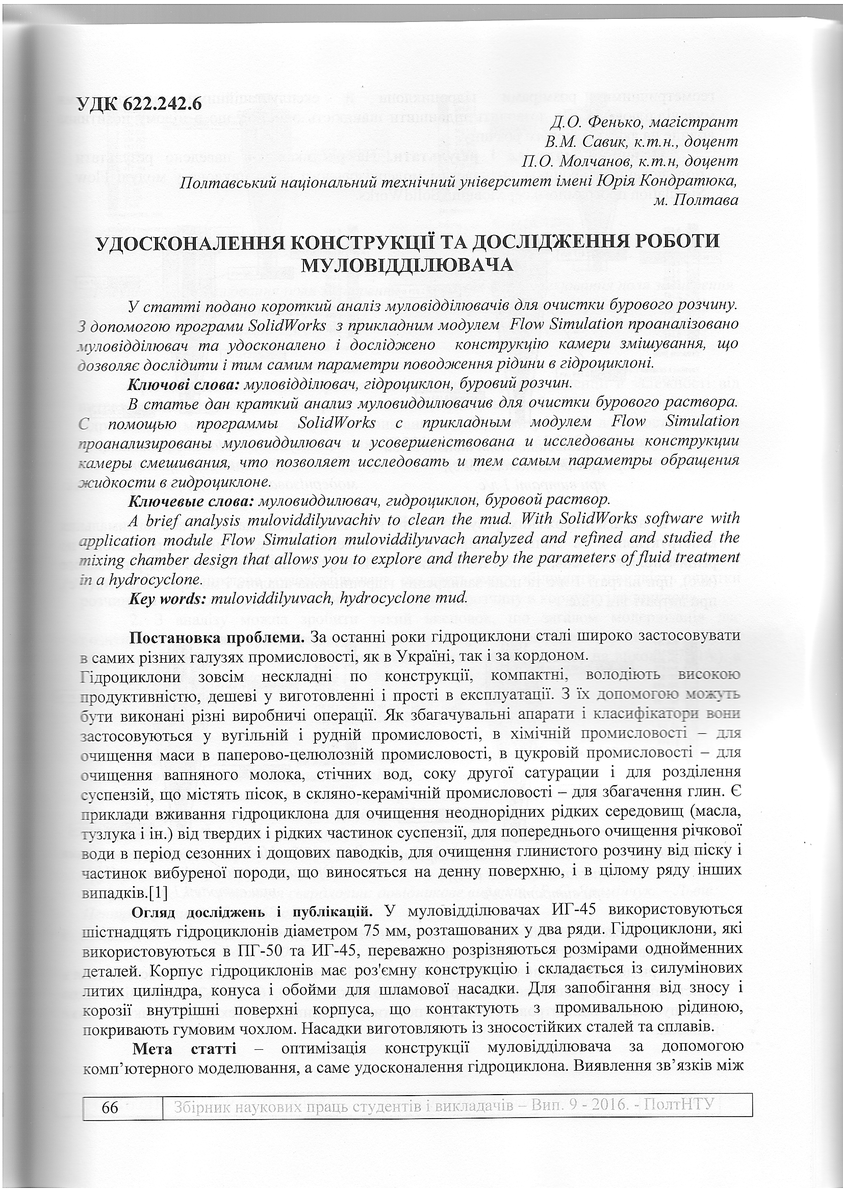 Удосконалення конструкції та дослідження та дослідження роботи муловідділювача