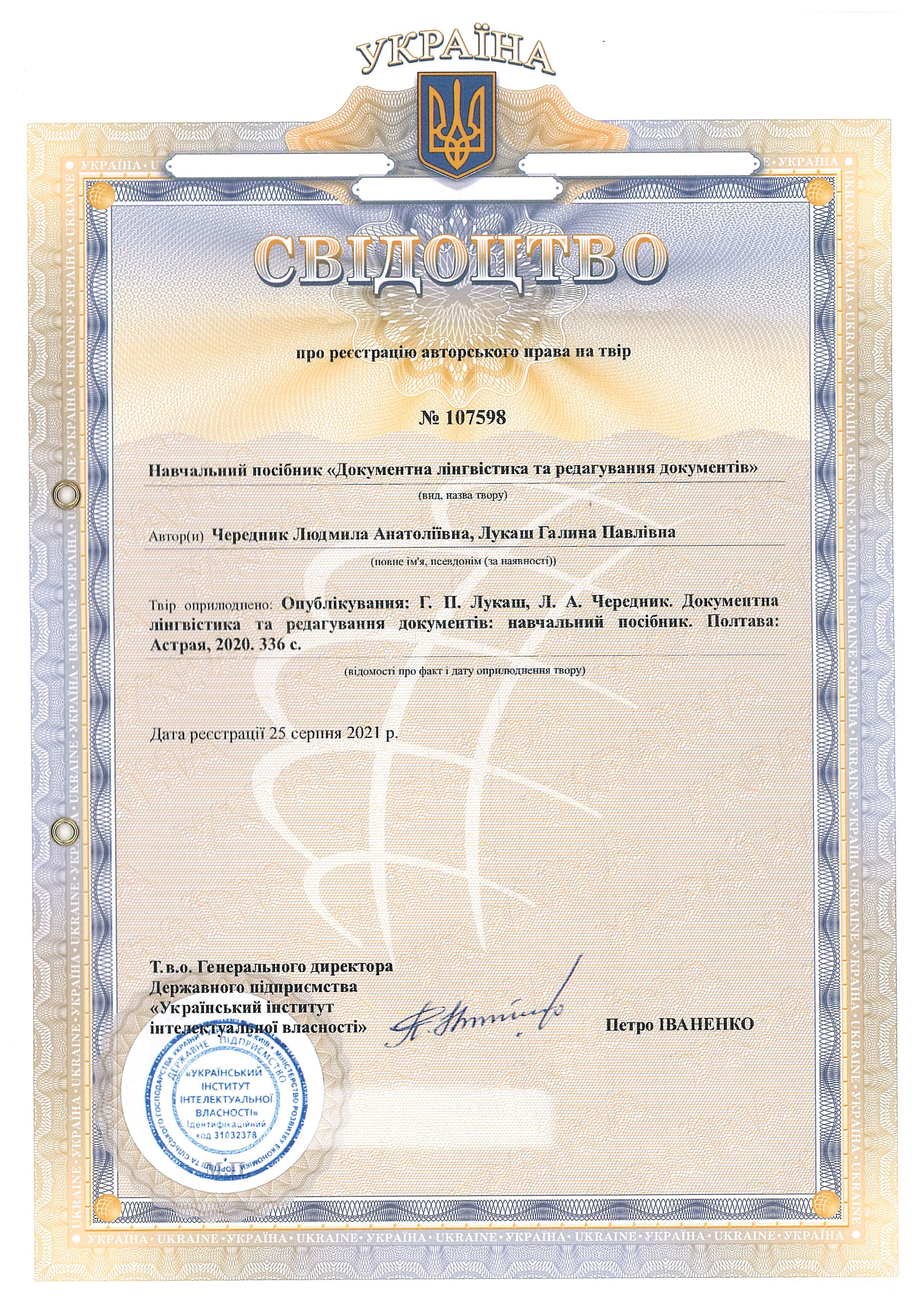 Свідоцтво про реєстрацію авторського права № 107598 на твір «Документна лінгвістика та редагування документів : навч. посіб. »