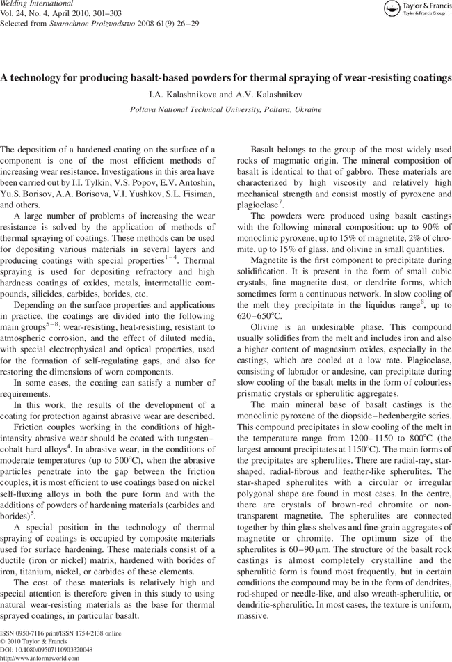A technology for producing basalt-based powders for thermal spraying of wear-resisting coatings