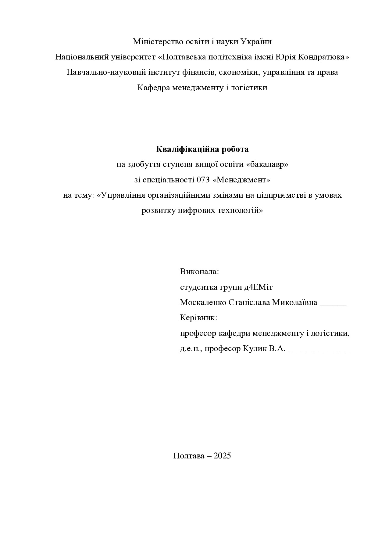 Управління організаційними змінами на підприємстві в умовах розвитку цифрових технологій