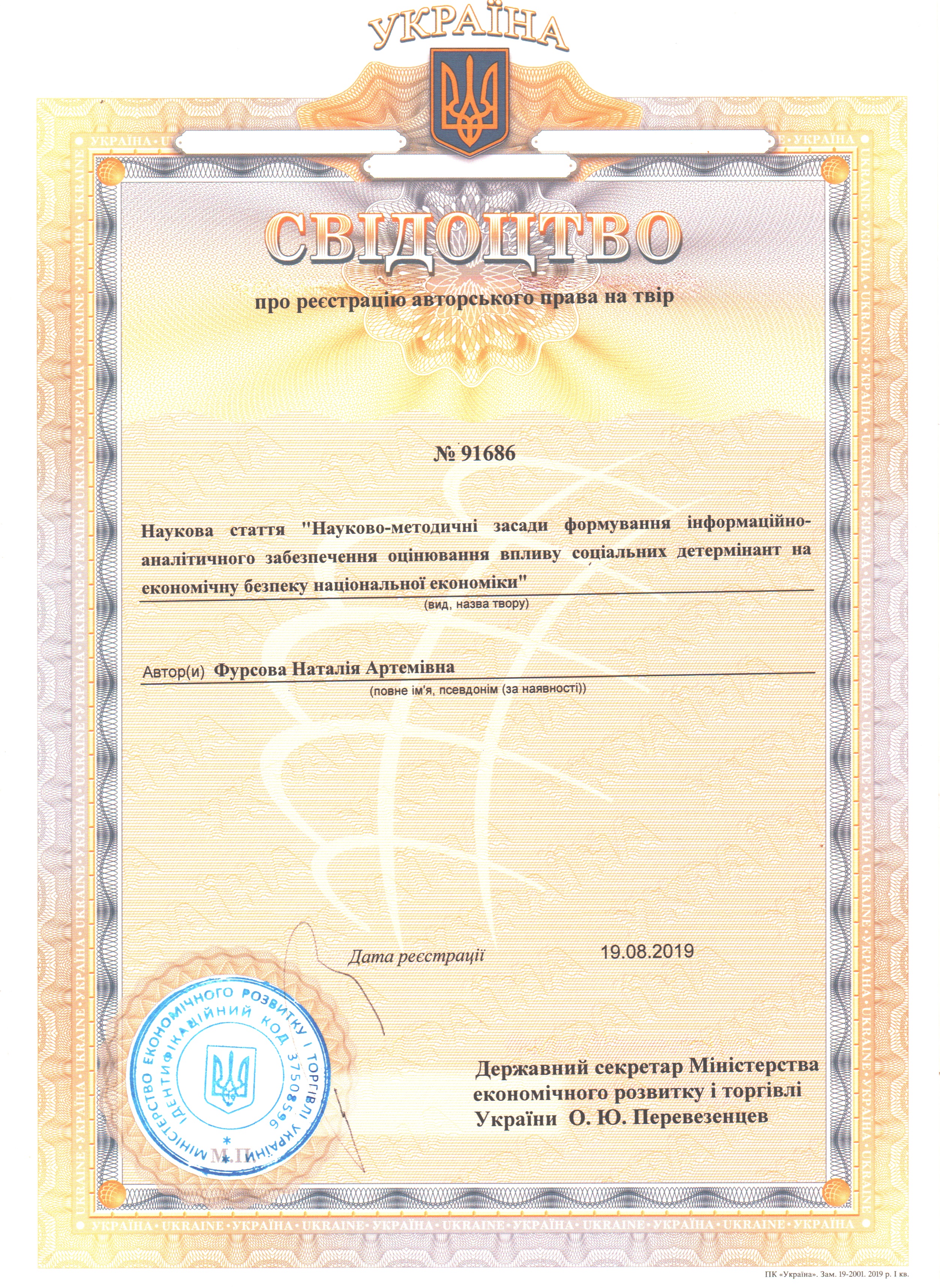 Свідоцтво про реєстрацію авторського права № 91686 Україна на твір. Наукова стаття "Наукво-методичні засади формування інформаційно-аналітичного забезпечення оцінювання впливу соціальних детермінант на економічну безпеку національної економіки "