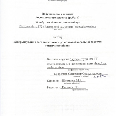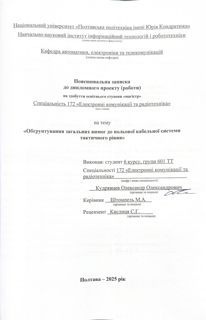 Дипломна робота 2026/04/08Обґрунтування загальних вимог до польової кабельної системи тактичного рівня