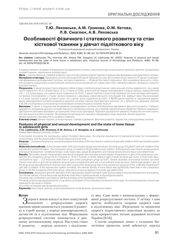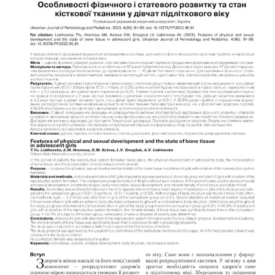 Стаття 2026/04/02Особливості фізичного і статевого розвитку та стан кісткової тканини у дівчат підліткового віку