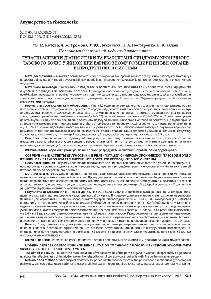 Стаття 2026/04/03Сучасні аспекти діагностики та реабілітації синдрому хронічного тазового болю у жінок при варикозному розширенні вен органів репродуктивної системи