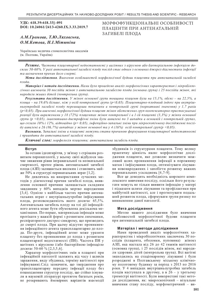 Мета дослідження - вивчення особливостей морфологічної будови плаценти при антенатальній загибелі...