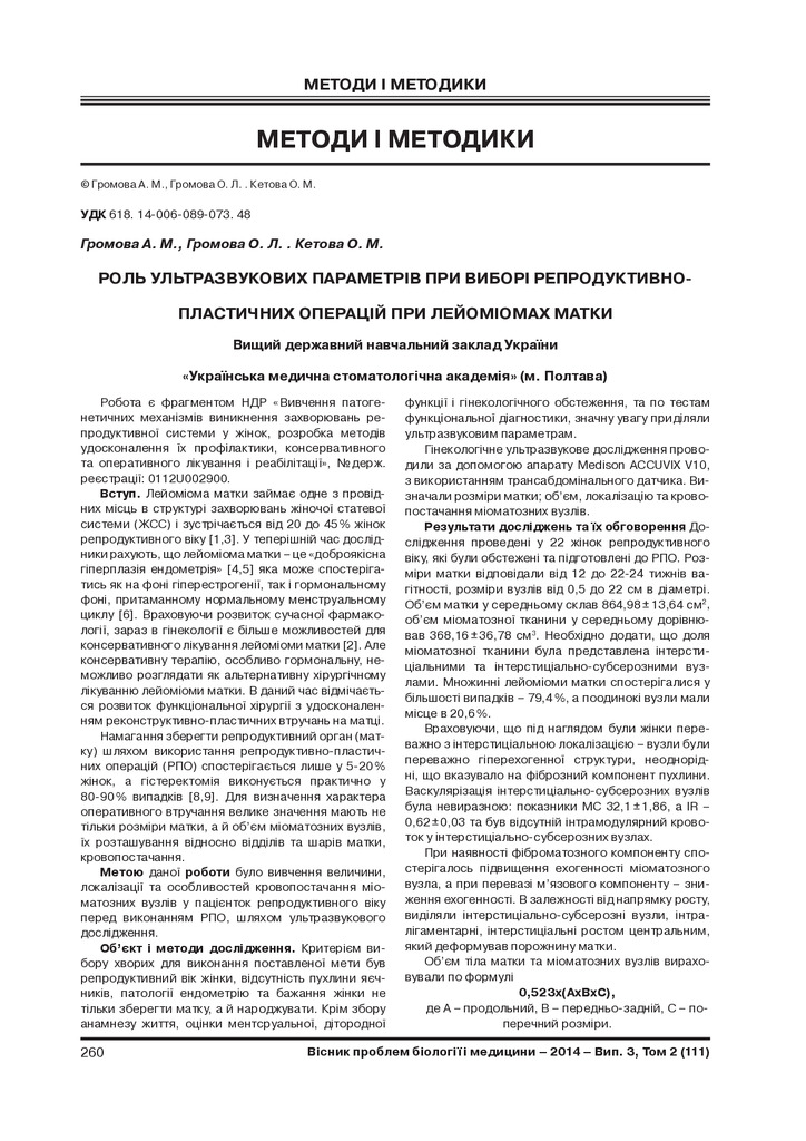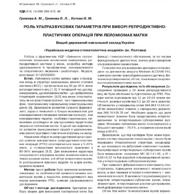 Стаття 2026/04/07Роль ультразвукових параметрів при виборі репродуктивно-пластичних операцій при лейоміомах матки