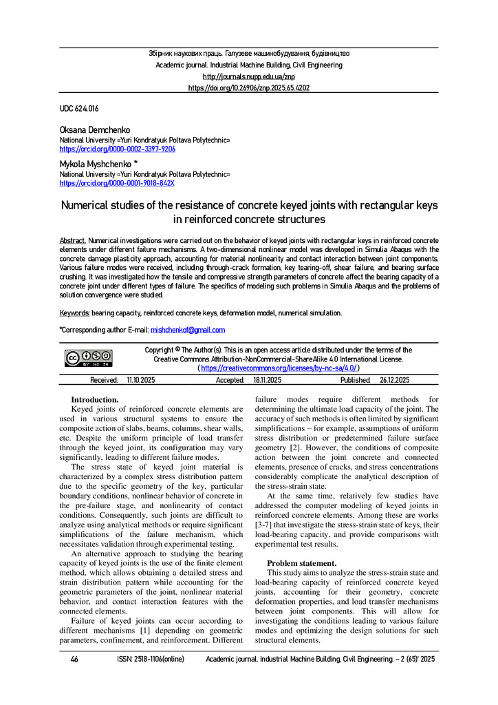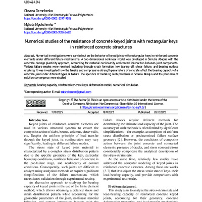 Стаття 2026/03/24Numerical studies of the resistance of concrete keyed joints with rectangular keys in reinforced concrete structures