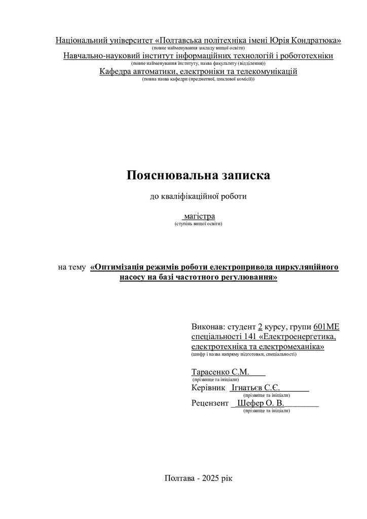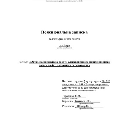 Дипломна робота 2026/03/30Оптимізація режимів роботи електропривода циркуляційного насосу на базі частотного регулювання