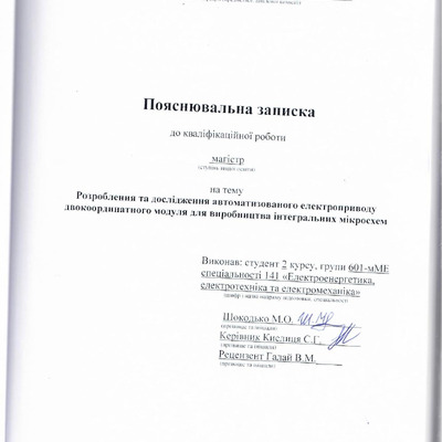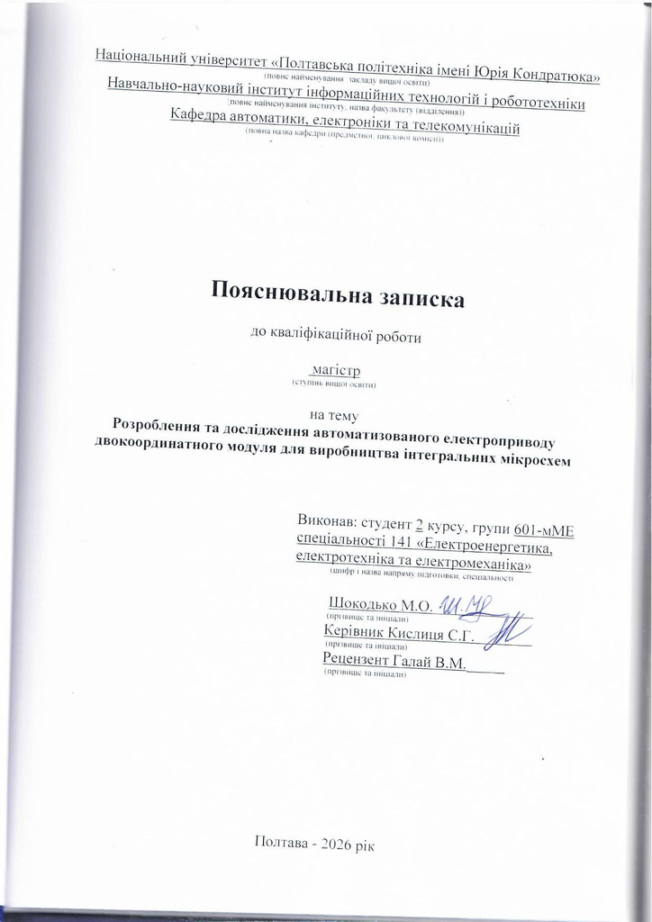 Дипломна робота 2026/03/30Розроблення та дослідження автоматизованого електроприводу двокоординатного модуля для виробництва інтегральних мікросхем