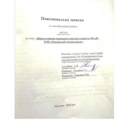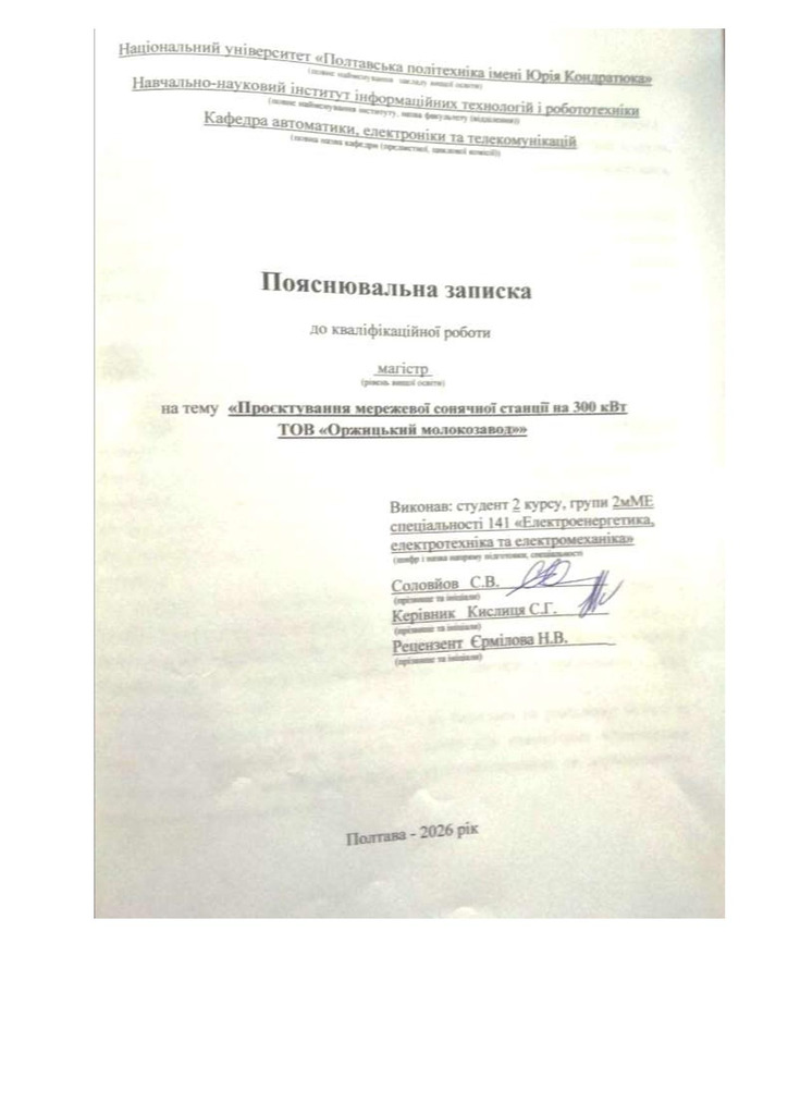 Дипломна робота 2026/03/31Проєктування мережевої сонячної станції на 300 кВт ТОВ «Оржицький молокозавод»
