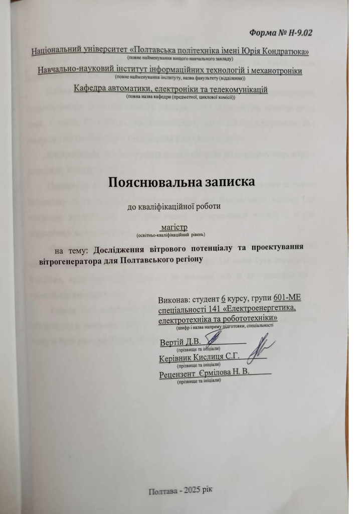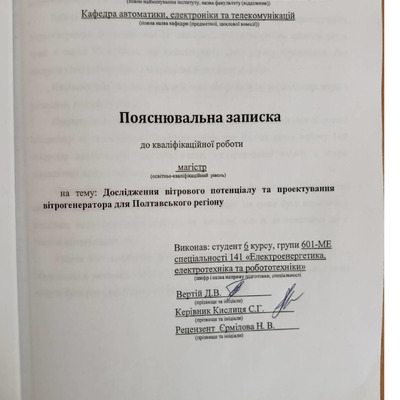 Дипломна робота 2026/03/30Дослідження вітрового потенціалу та проектування вітрогенератора для Полтавського регіону