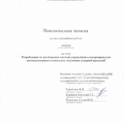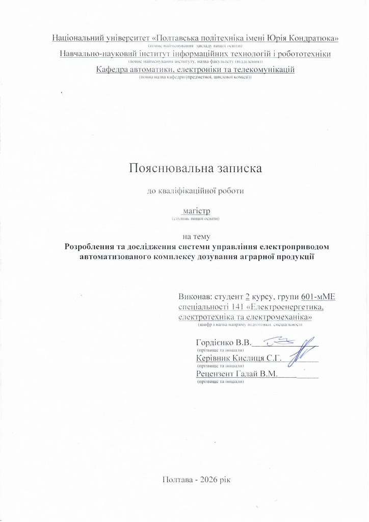 Дипломна робота 2026/03/30Розроблення та дослідження системи управління електроприводом автоматизованого комплексу дозування аграрної продукції
