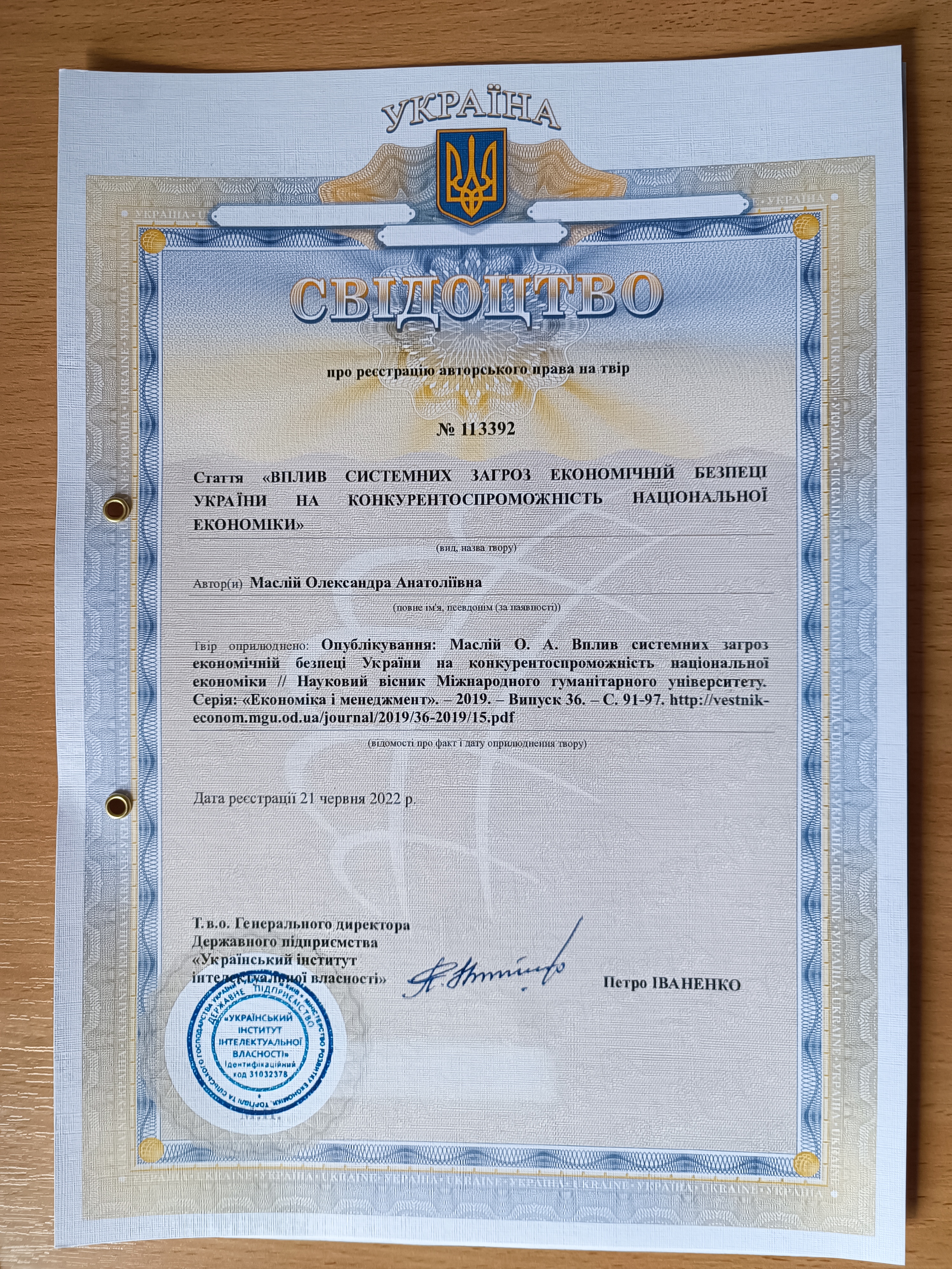 Свідоцтво про реєстрацію авторського права 113392 на твір «Вплив системних загроз економічній безпеці України на конкурентоспроможність національної економіки»