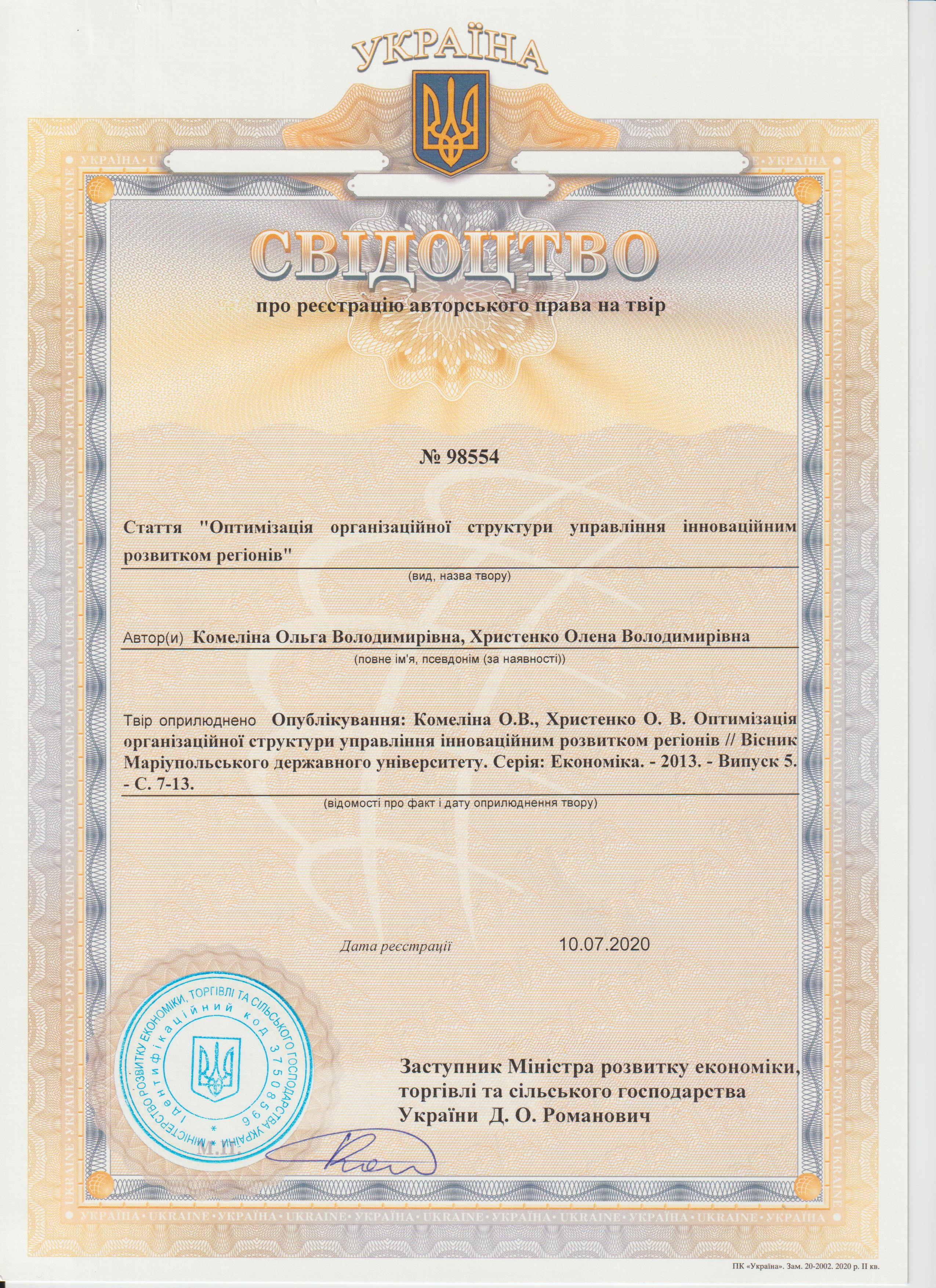 Свідоцтво про реєстрацію авторського права № 98554 на твір «Оптимізація організаційної структури управління інноваційним розвитком регіонів»