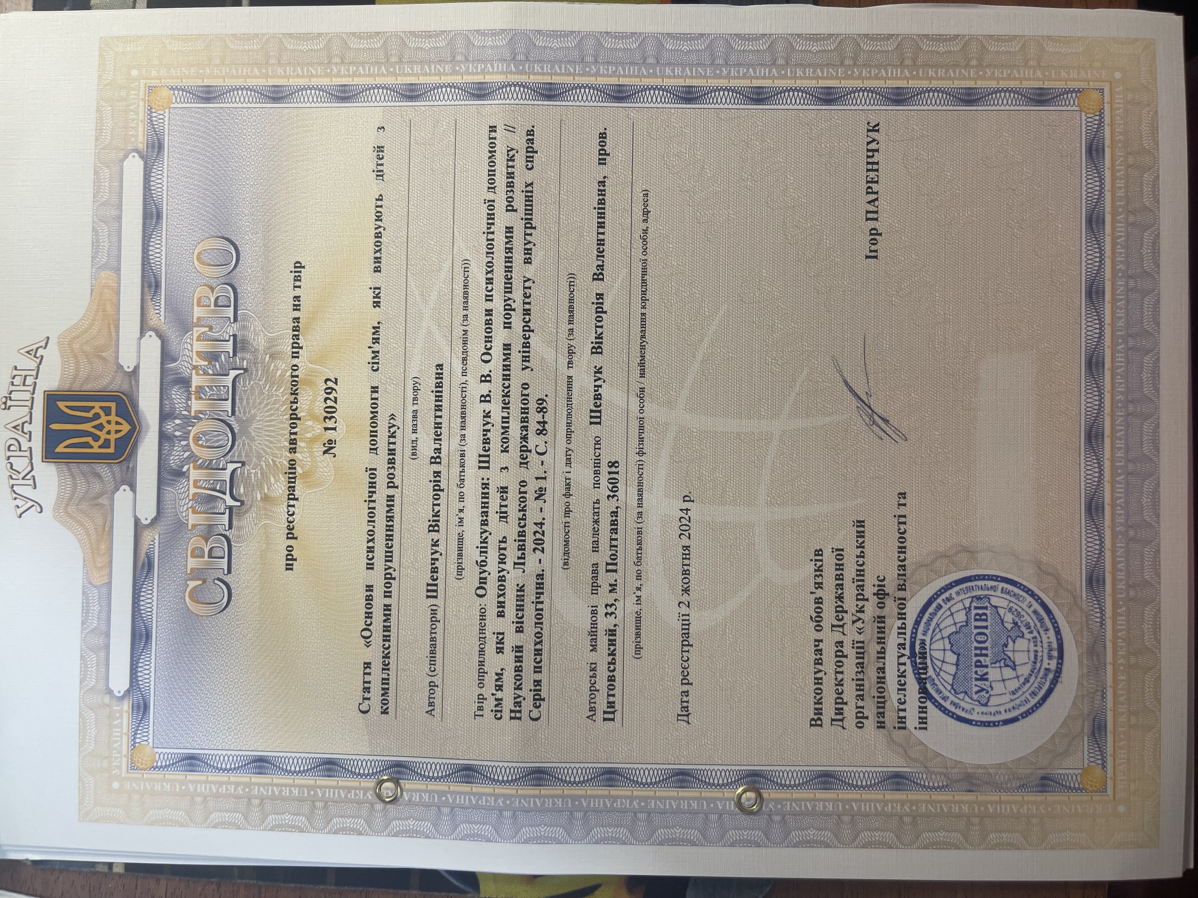 Свідоцтво про реєстрацію авторського права № 130292 на твір «Основи психологічної допомоги сім'ям, які виховують дітей з комплексними порушеннями розвитку»