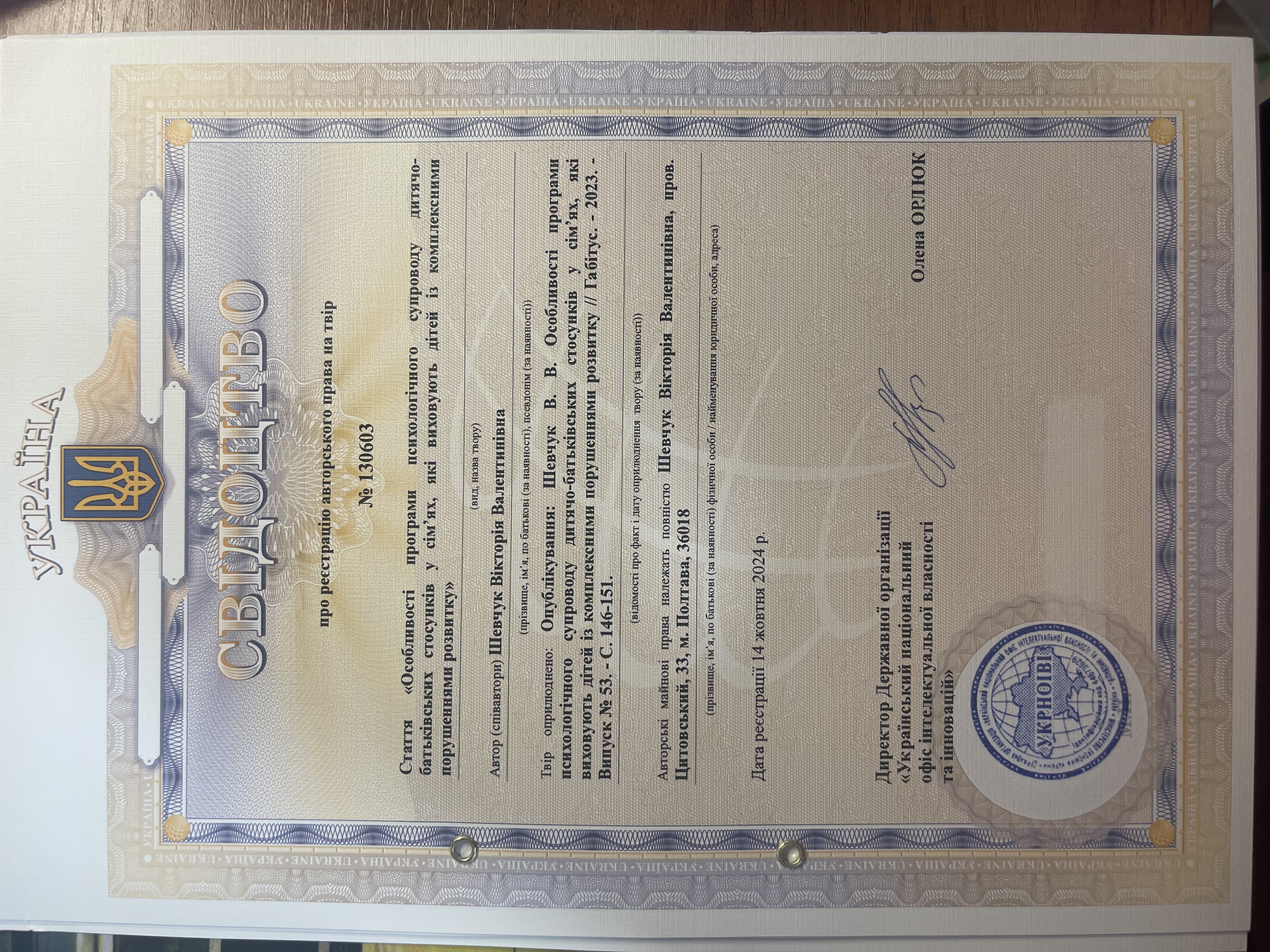 Свідоцтво про реєстрацію авторського права № 130603 на твір «Особливості програми психологічного супроводу дитячо-батьківських стосунків у сім'ях, які виховують дітей із комплексними порушеннями розвитку»