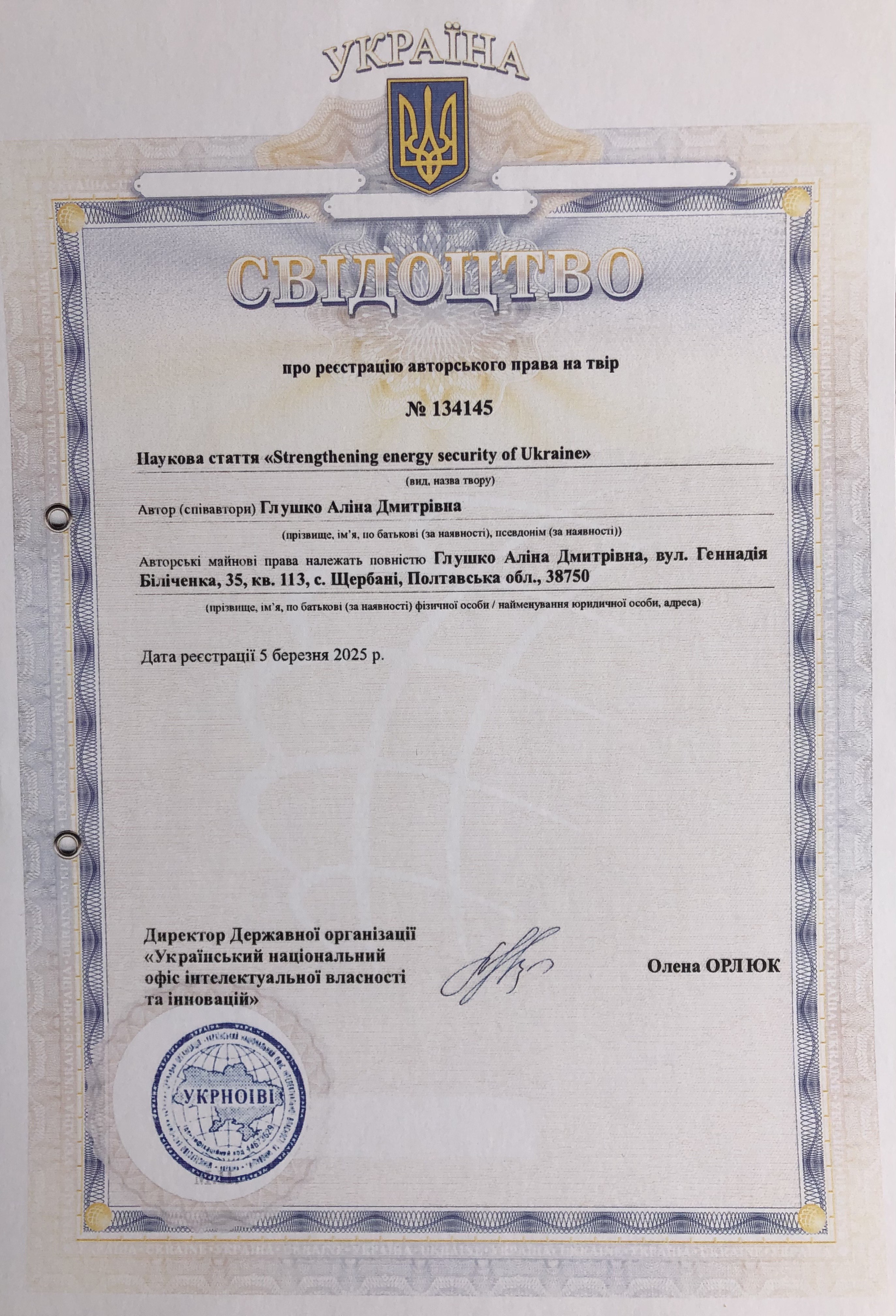 Свідоцтво про реєстрацію авторського права № 134145 на твір «Strengthening energy security of Ukraine»