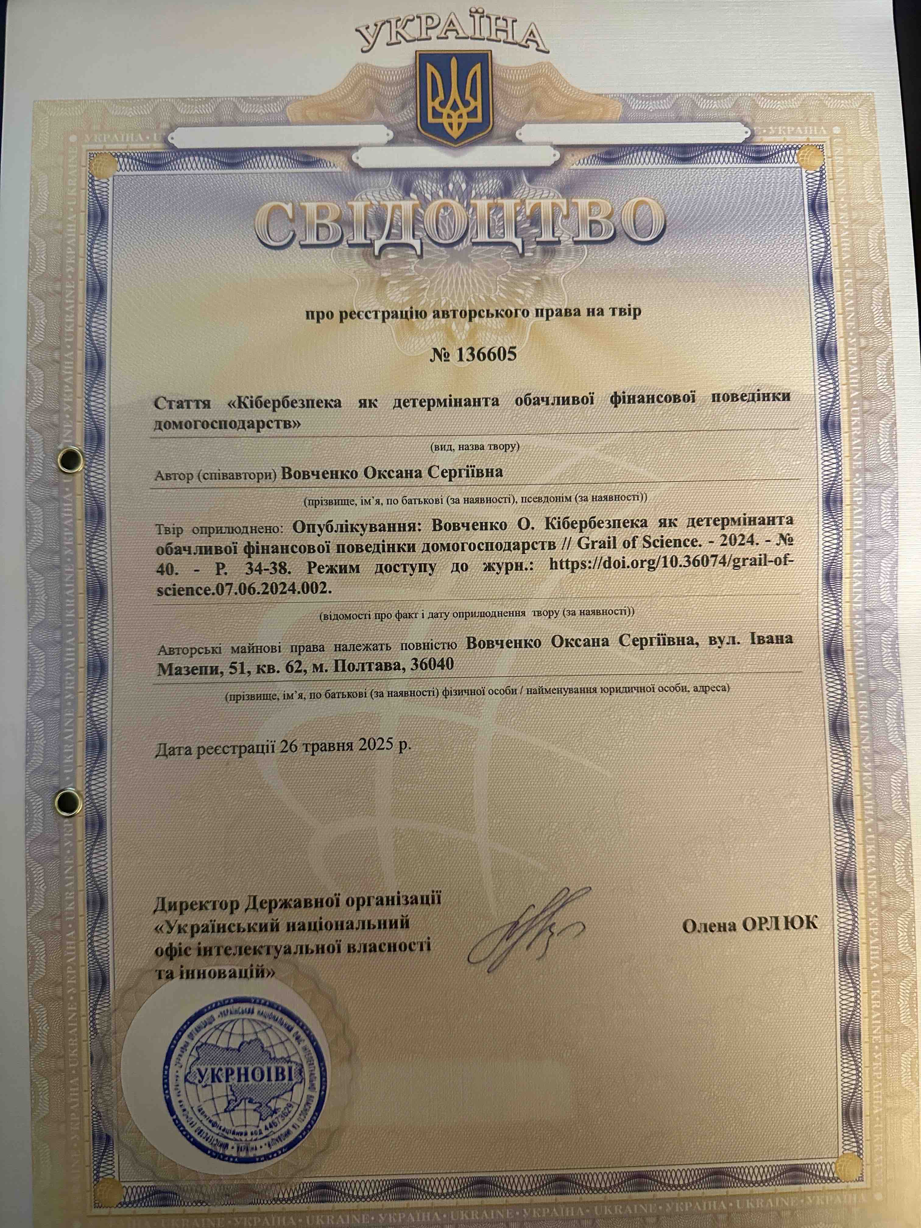 Свідоцтво про реєстрацію авторського права № 136605 на твір «Кібербезпека як детермінанта обачливої фінансової поведінки домогосподарств»