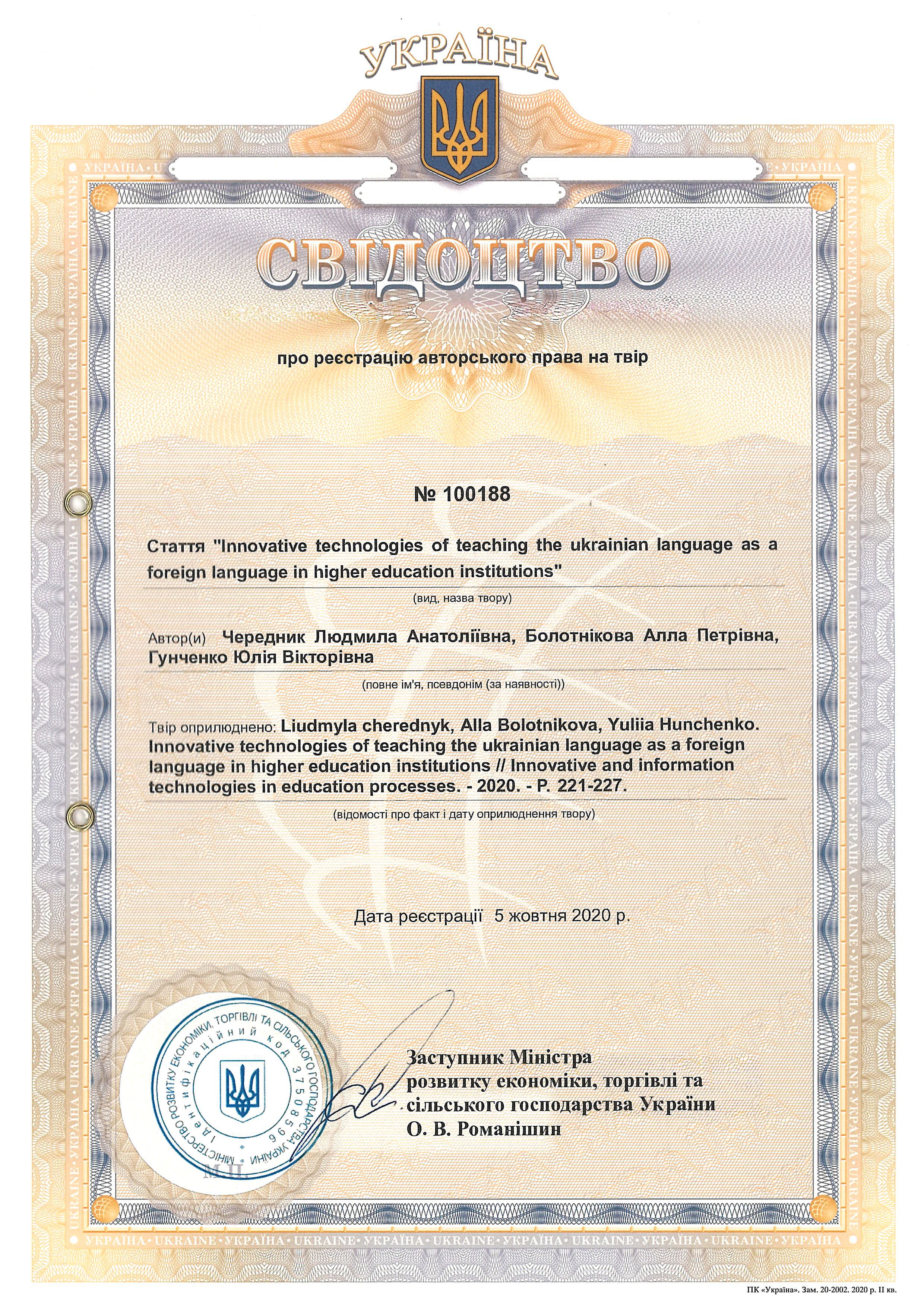 Свідоцтво про реєстрацію авторського права № 100188 Україна на твір "Innovative technologies of teaching the Ukrainian language as a foreign language in higher education institutions"