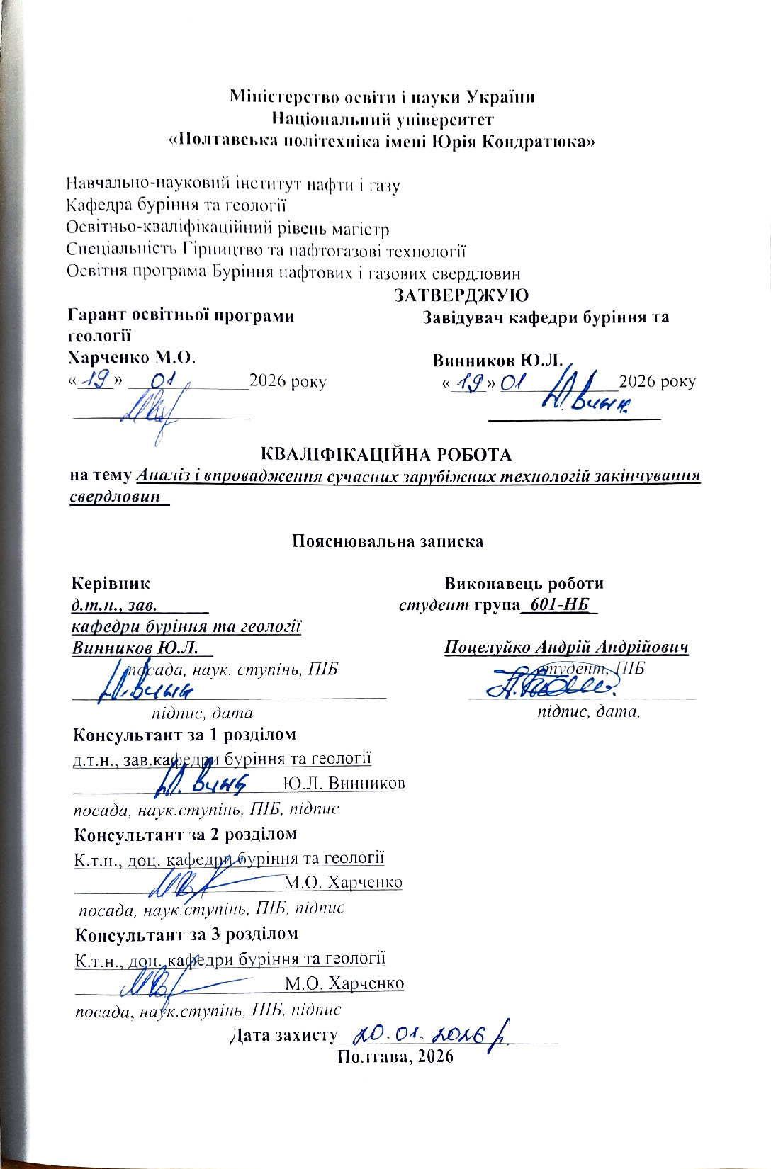 Поцелуйко А.А. Аналіз і впровадження сучасних зарубіжних технологій закінчування свердловин : кваліф. робота магістра за спеціальністю 185 «Нафтогазова інженерія та технології» / А.А. Поцелуйко. – Полтава : Нац. ун-т ім. Юрія Кондратюка, 2026. – 78 с.