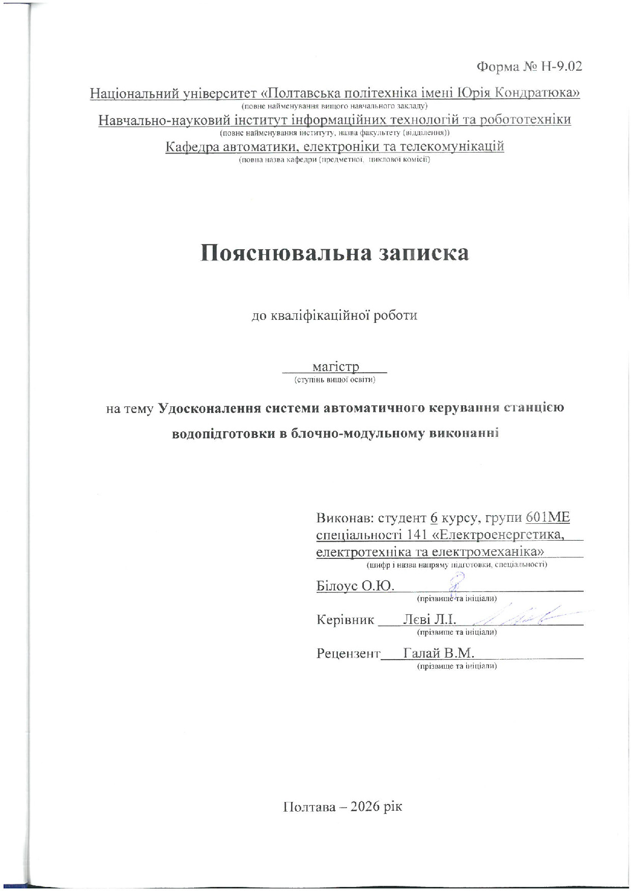 Удосконалення системи автоматичного керування станцією водопідготовки в блочно-модульному виконанні