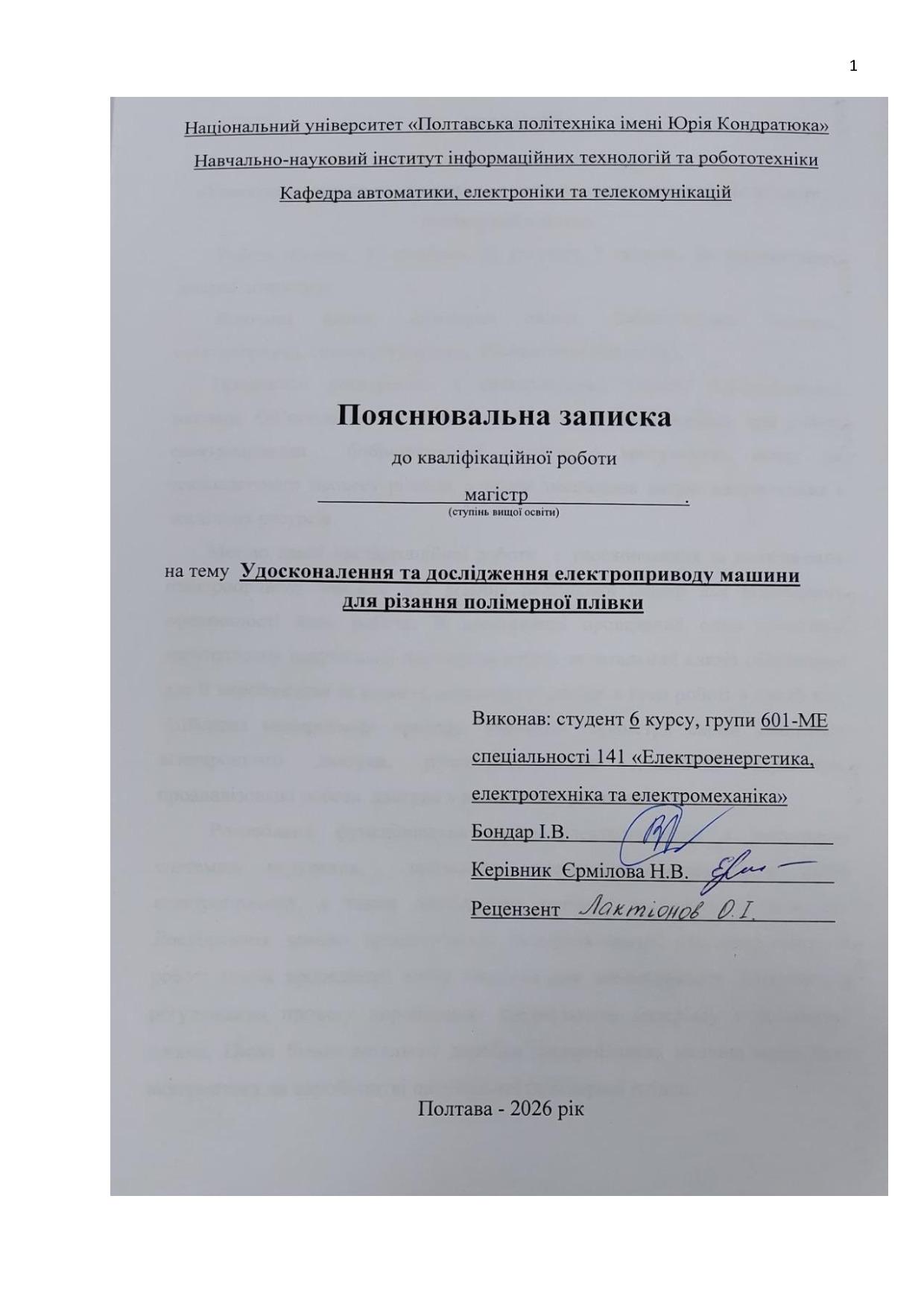 Бондар І.В. Удосконалення та дослідження електроприводу машини для різання полімерної плівки : кваліф. робота магістра за спеціальністю 141 «Електроенергетика, електротехніка та електромеханіка» / І.В. Бондар. – Полтава : Нац. ун-т ім. Юрія Кондратюка, 2026. – 103 с.
