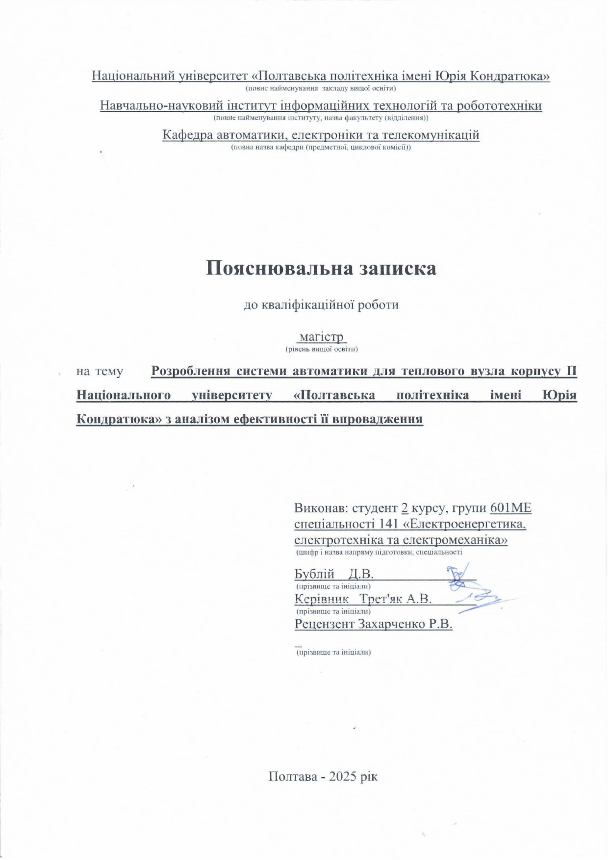 Розроблення системи автоматики для теплового вузла корпусу П Національного університету «Полтавська політехніка імені Юрія Кондратюка» з аналізом ефективності її впровадження