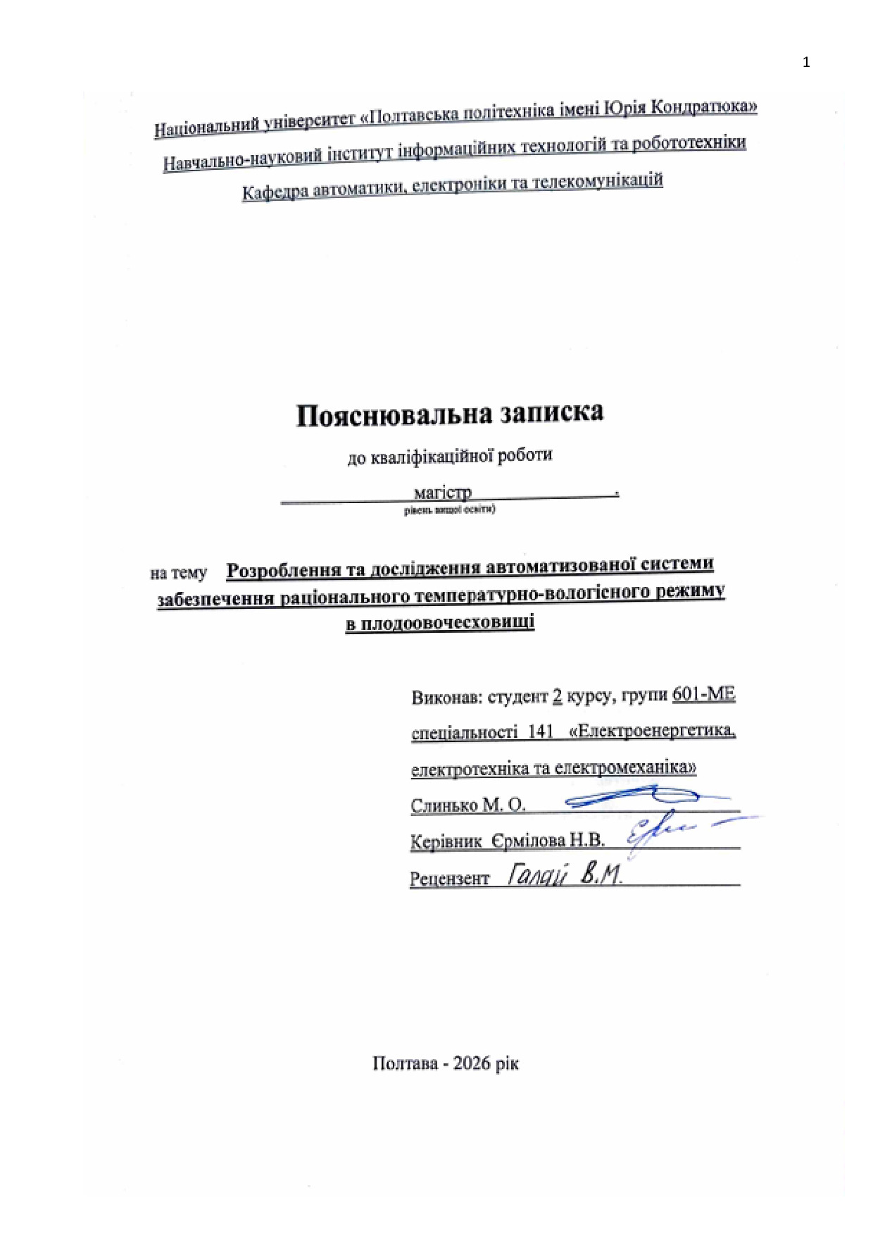 Розроблення та дослідження автоматизованої системи забезпечення раціонального температурно-вологісного режиму в плодоовочесховищі
