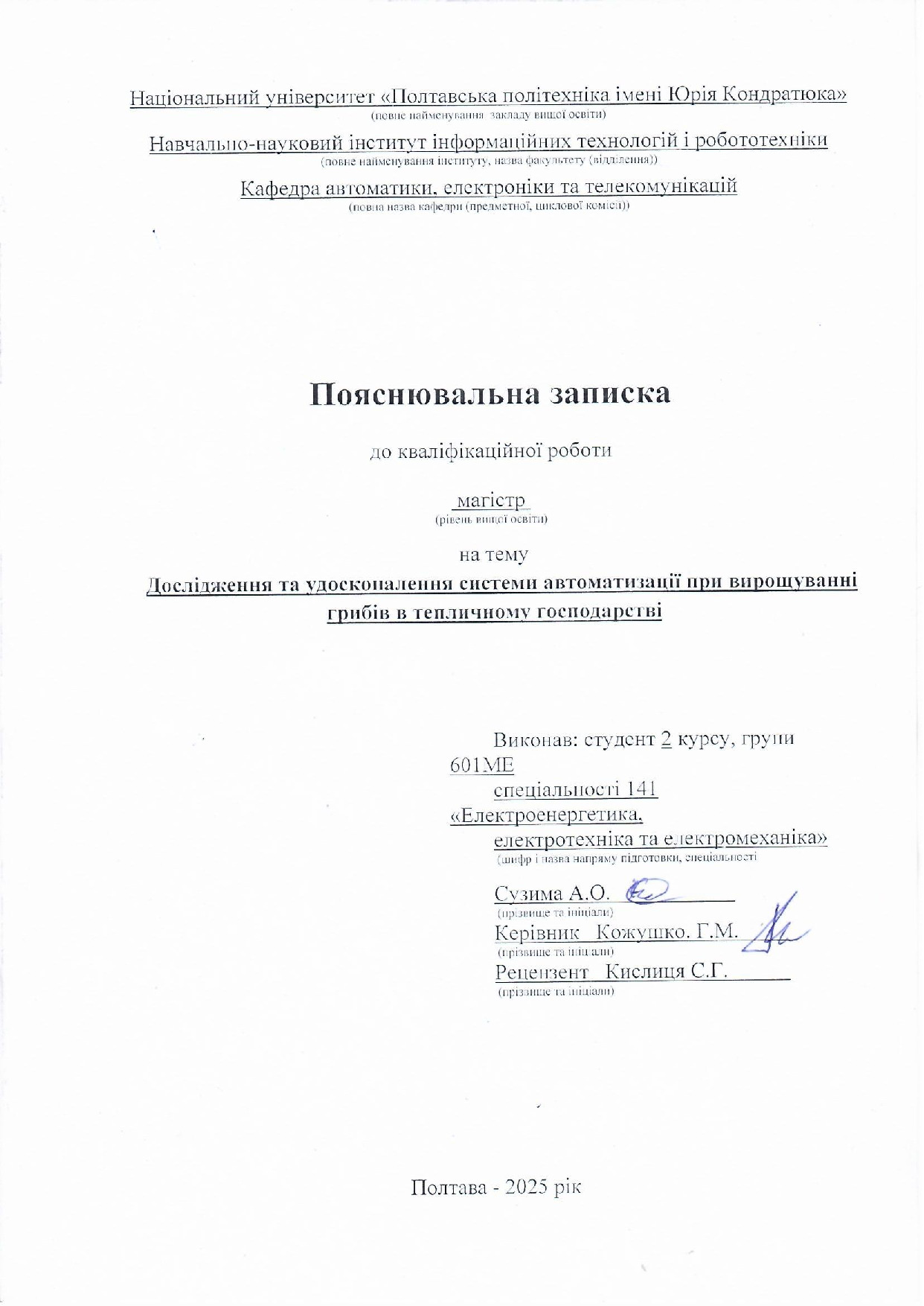 Дослідження та удосконалення системи автоматизації при вирощувані грибів в тепличному господарстві