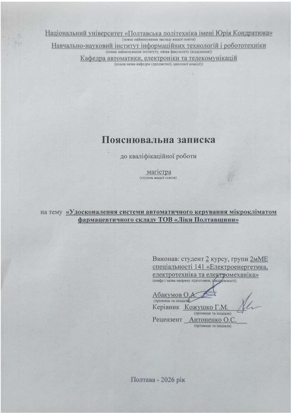 Удосконалення системи автоматичного керування мікрокліматом фармацевтичного складу ТОВ "Ліки Полтавщини"