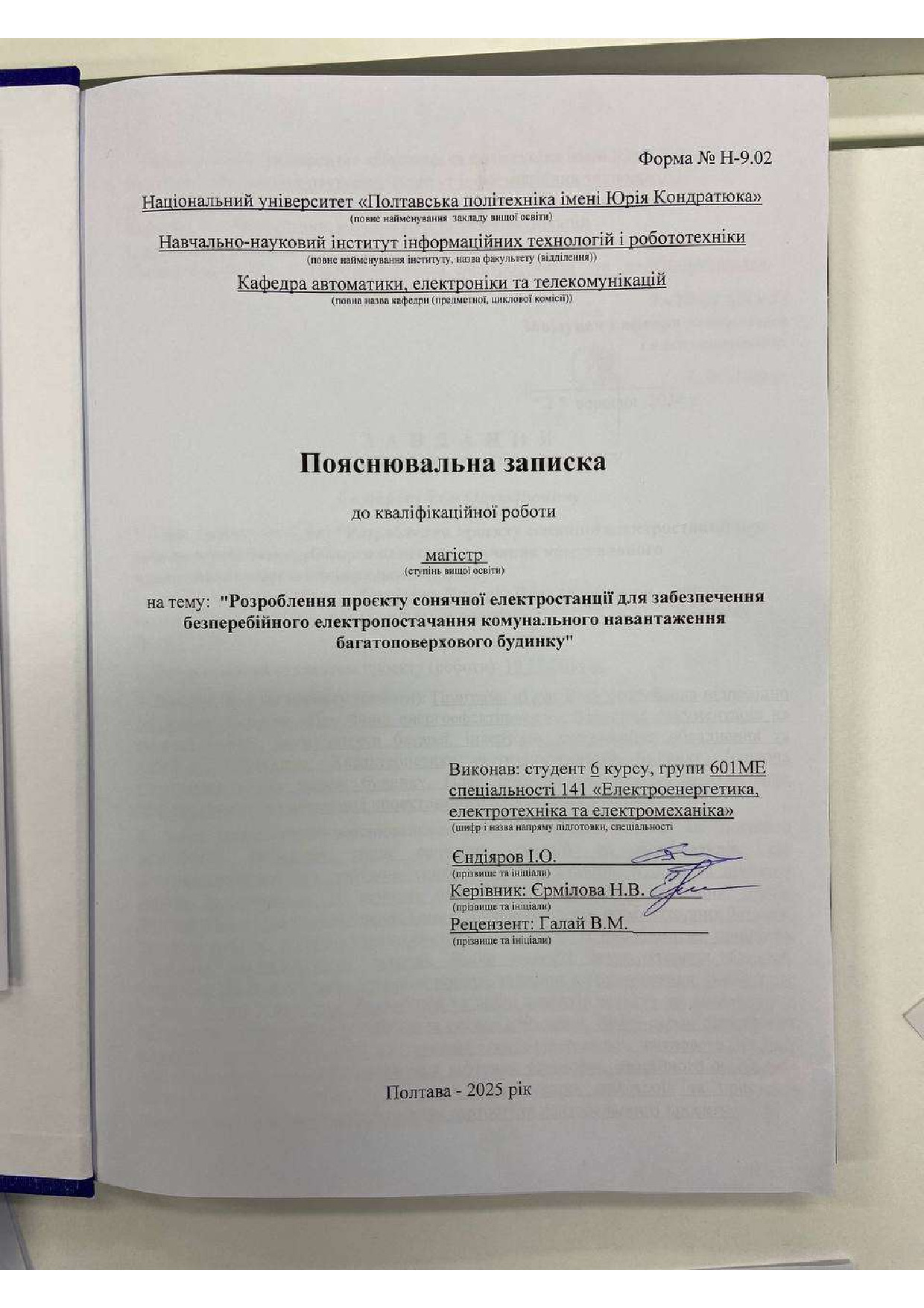 Розроблення проєкту сонячної електростанції для забезпечення безперебійного електропостачання комунального навантаження багатоповерхового будинку