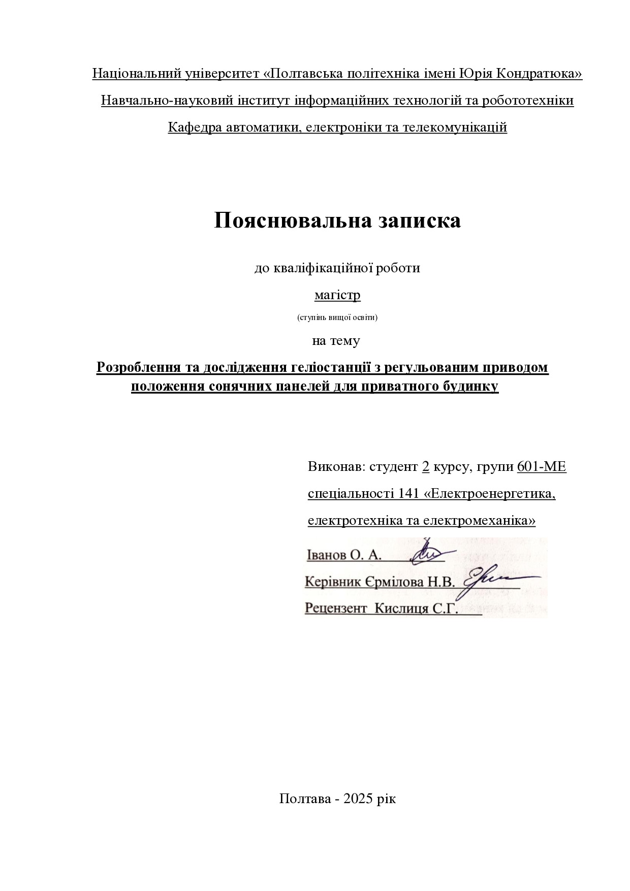 Розроблення та дослідження геліостанції з регульованим приводом положення сонячних панелей для приватного будинку