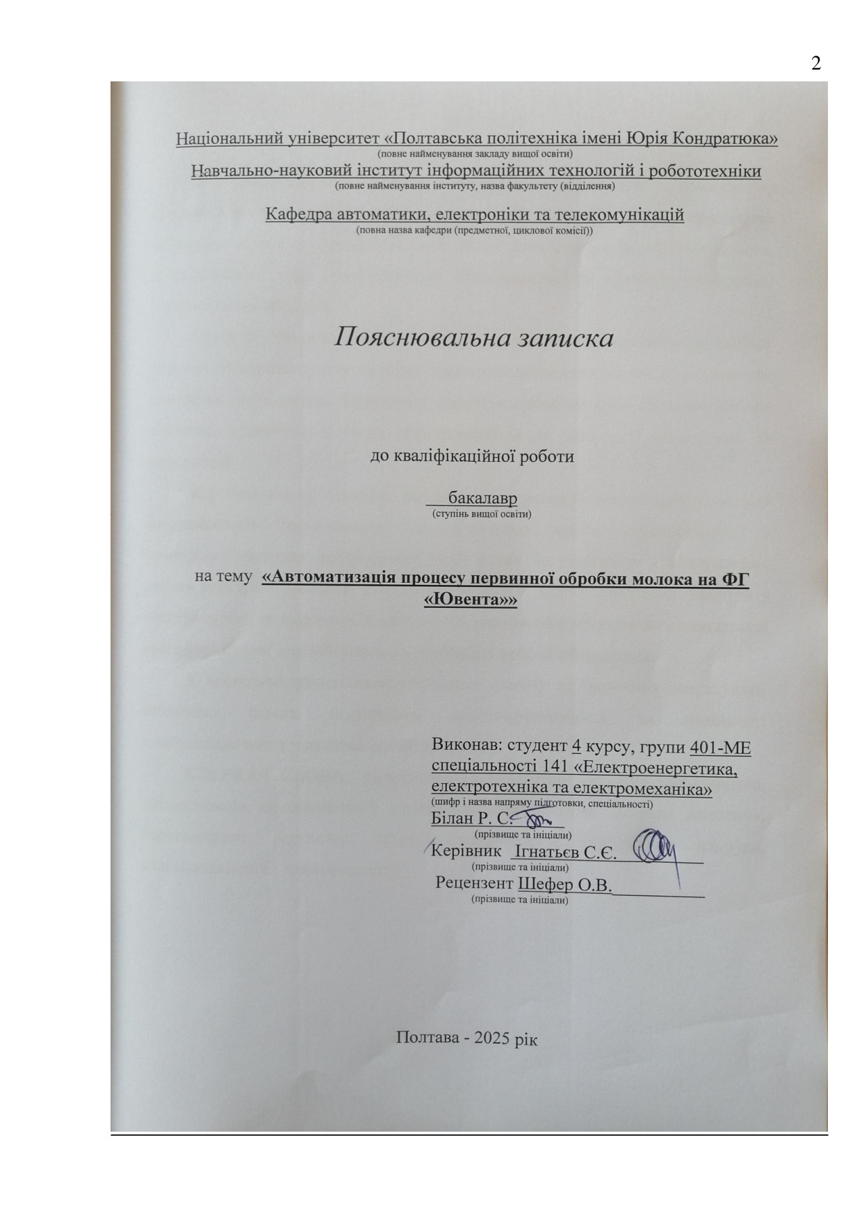Автоматизація процесу первинної обробки молока на ФГ «Ювента»: