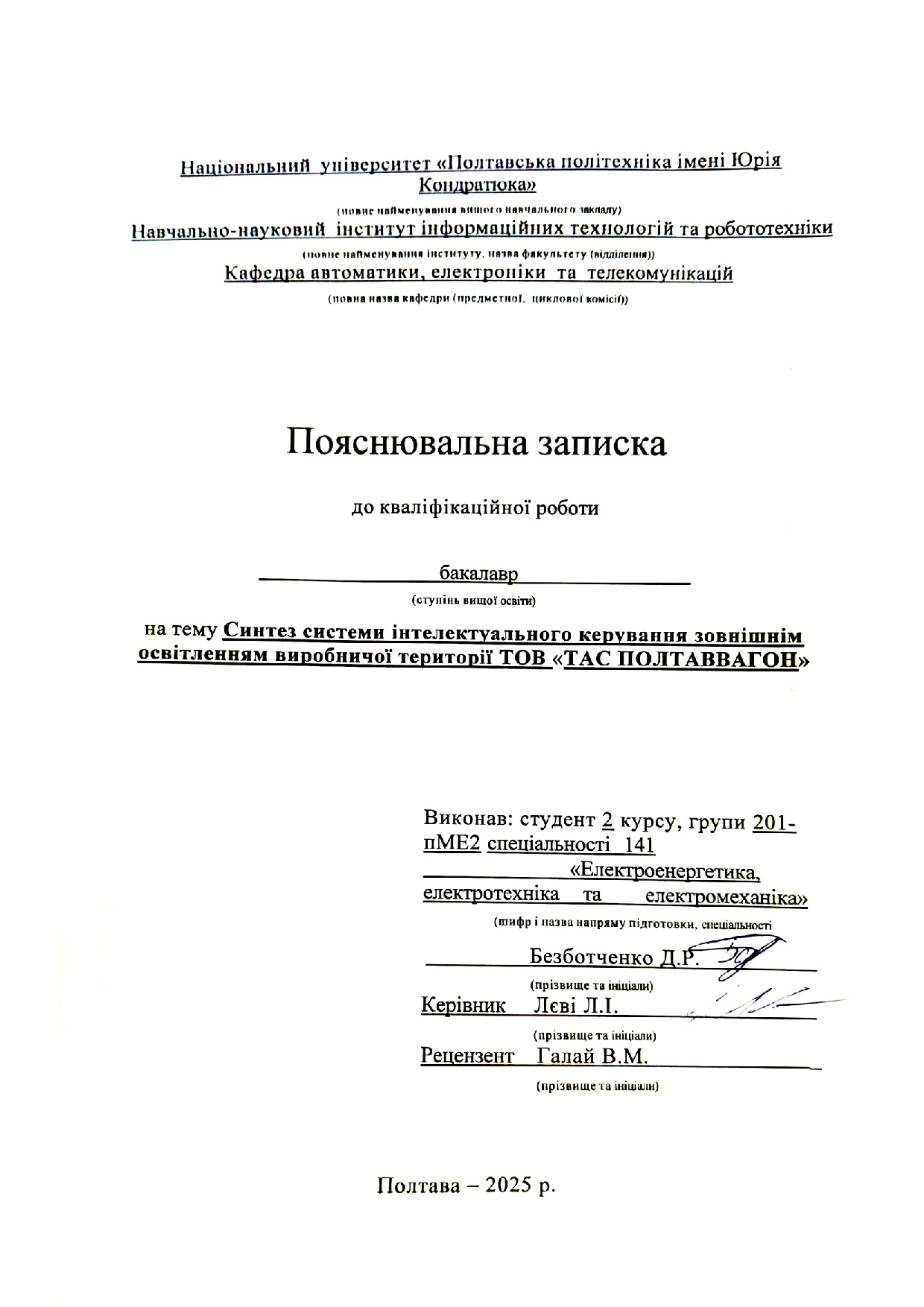 Синтез системи інтелектуального керування зовнішнім освітленням виробничої території ТОВ «ТАС ПОЛТАВВАГОН»