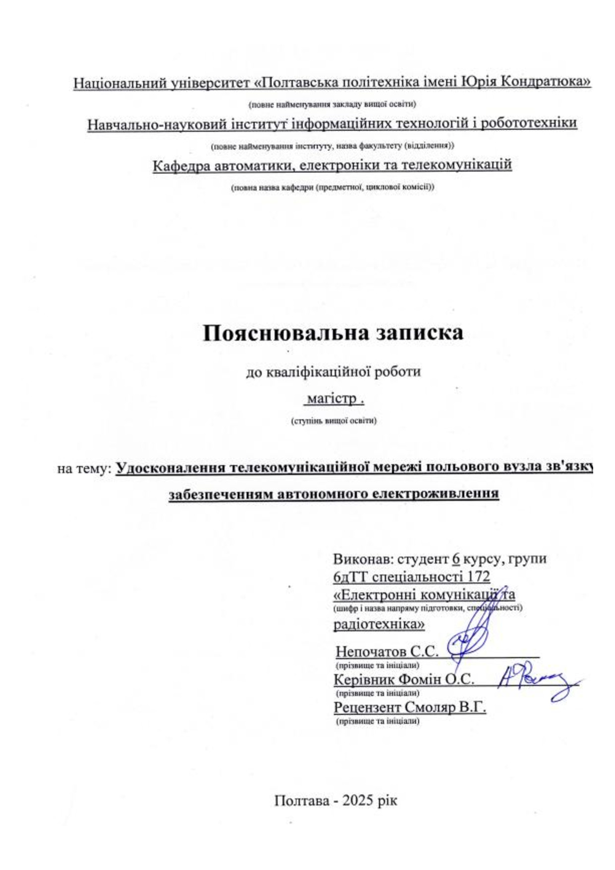 Удосконалення телекомунікаційної мережі польового вузла зв'язку із забезпеченням автономного електроживлення