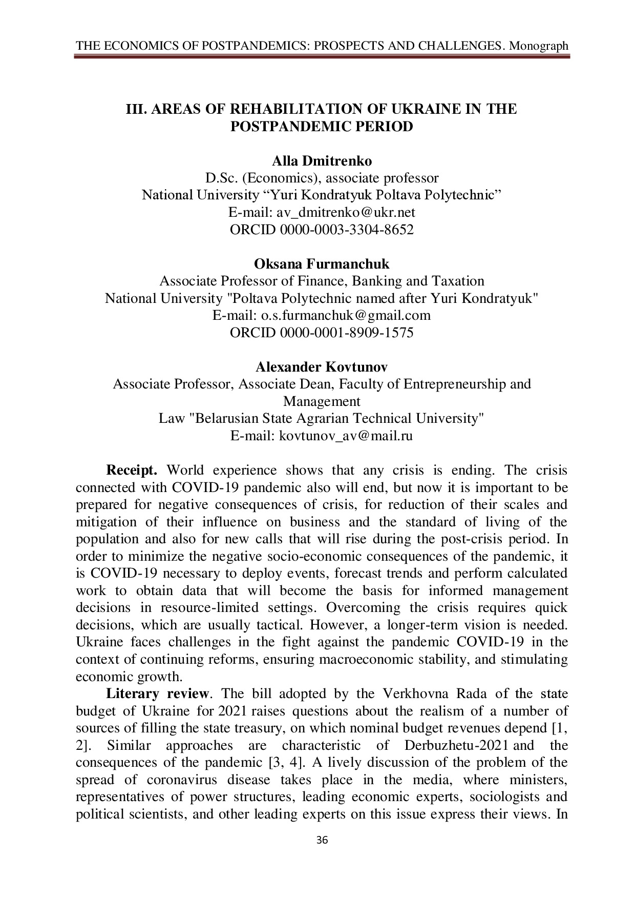 Areas of rehabilitation of Ukraine in the postpandemic period