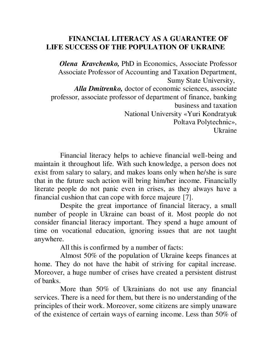 Financial literacy as a guarantee of life success of the population of Ukraine