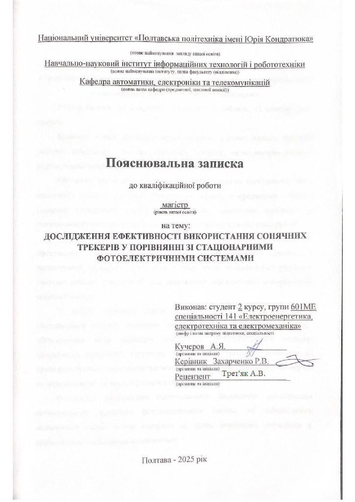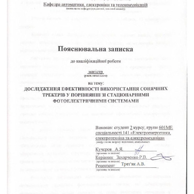Дипломна робота 2026/04/01Дослідження ефективності використання сонячних трекерів у порівнянні зі стаціонарними фотоелектричними системами