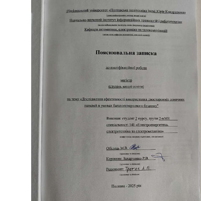 Дипломна робота 2026/04/02Дослідження ефективності використання двосторонніх сонячних панелей в умовах багатоповерхового будинку