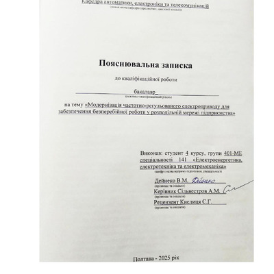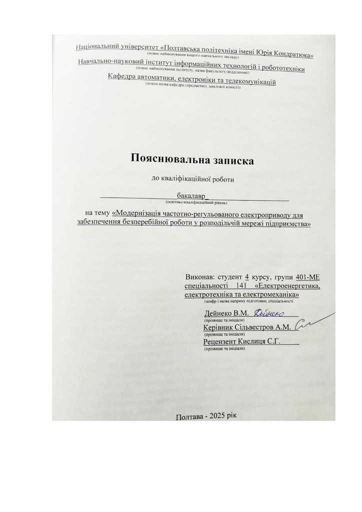 Дипломна робота 2026/04/20Модернізація частотно-регульованого електроприводу для забезпечення безперебійної роботи у розподільчій мережі підприємства