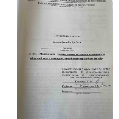 Дипломна робота 2026/04/08Модернізація електропривода установки для очищення оборотної води в замкненому циклі нафтопереробних заводі