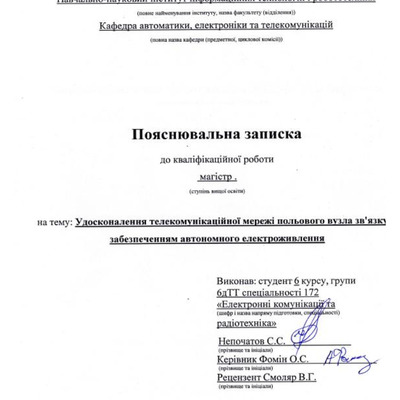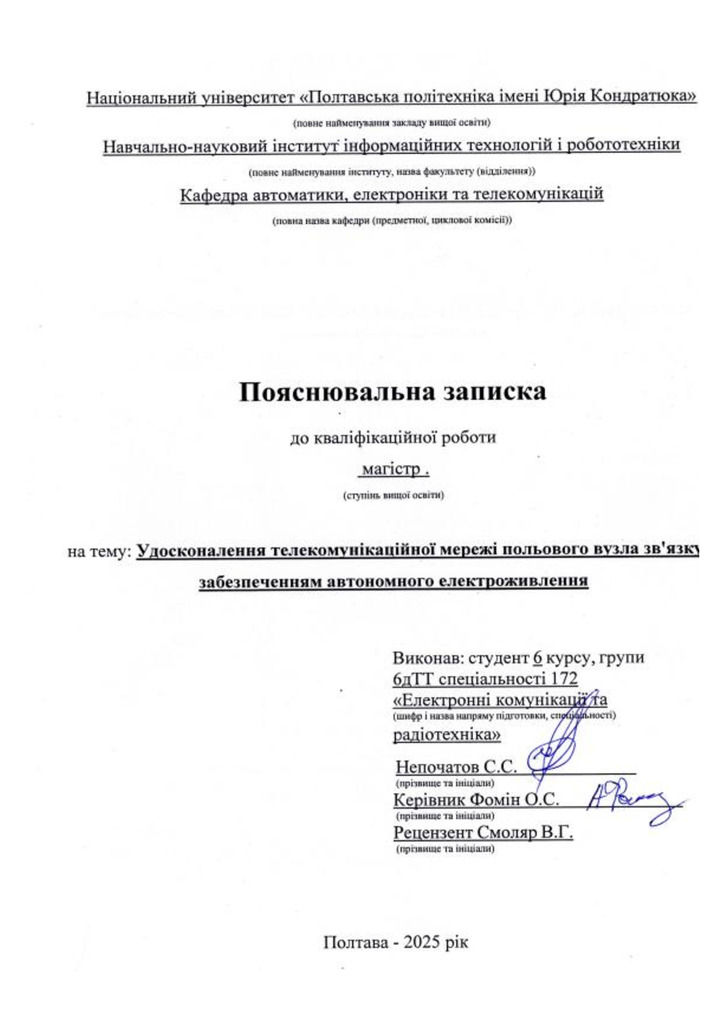 Дипломна робота 2026/04/08Удосконалення телекомунікаційної мережі польового вузла зв'язку із забезпеченням автономного електроживлення