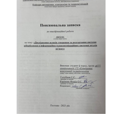 Дипломна робота 2026/04/08Дослідження шляхів створення та розгортання системи кібербезпеки в інформаційно-телекомунікаційних системах вузлів зв’язку